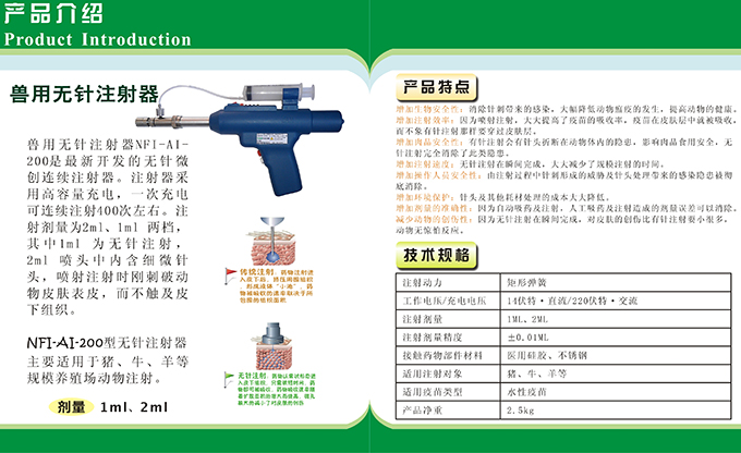 兽用无针注射器NFI-AI-200是最新开发的无针微创连续注射器。注射器采用高容量充电,一次充电可连续注射400次左右。适合猪、羊、牛等规模养殖场动物注射。注射剂量为2ml、1ml 两档,其中1ml 为无针注射,2ml 喷头中内含细微针头,喷射注射时刚刺破动物皮肤表皮,而不触及皮下组织。