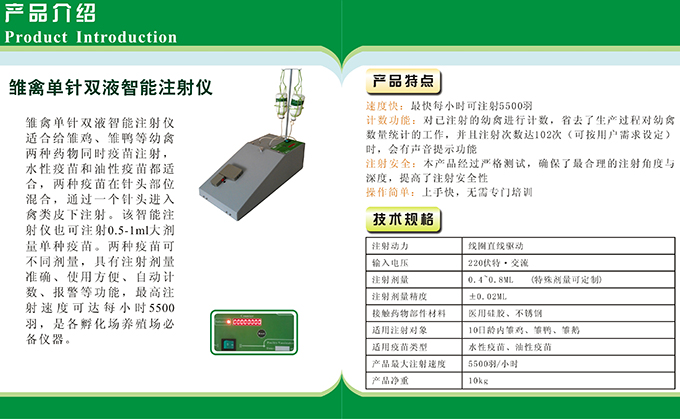 雏禽双液单针智能注射仪。适合给雏鸡、雏鸭等幼禽两种药物同时疫苗注射,水性疫苗和油性疫苗都适合,两种疫苗可不同剂量,具有注射剂量准确、使用方便、自动计数、报警等功能,最高注射速度可达每小时5000羽,是各孵化场养殖场必备仪器。