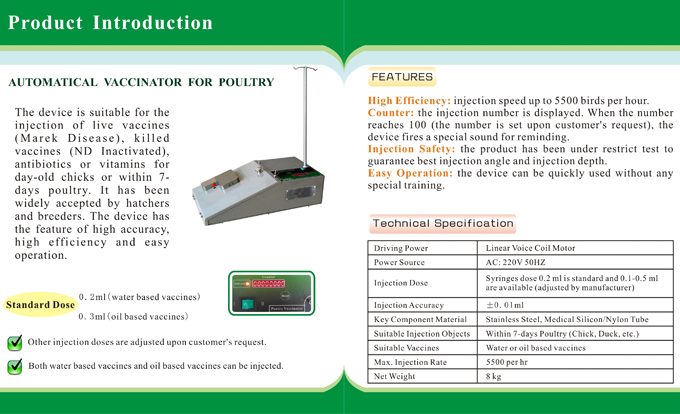 Poultry:AID-P-S, automatic vaccinator for day-old or winthin 7-day poultry, maximum 5000 injections per hour. Powered by advanced linear voice coil motor, no more compressive air pump. Very easy to operate.