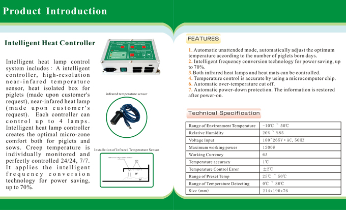 Intelligent heat lamp control system includes:A intelligent controller, high-resolution temperature sensor, heat isolated box for piglets (made upon customer's request), near-infared heat lamp (made upon customer's request). Each controller can control up to 4 lamps.