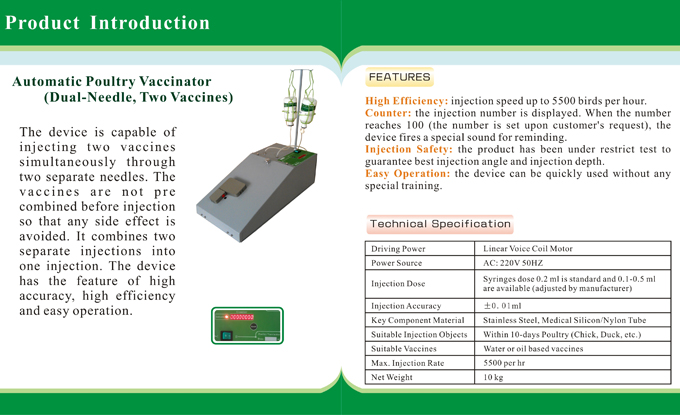 Poultry:AID-P-D, automatic vaccinator with double needles for day-old or winthin 7-day poultry, maximum 5000 injections per hour. Capable of injecting two vaccines simultaneously. Powered by advanced linear voice coil motor, no more compressive air pump. Very easy to operate.